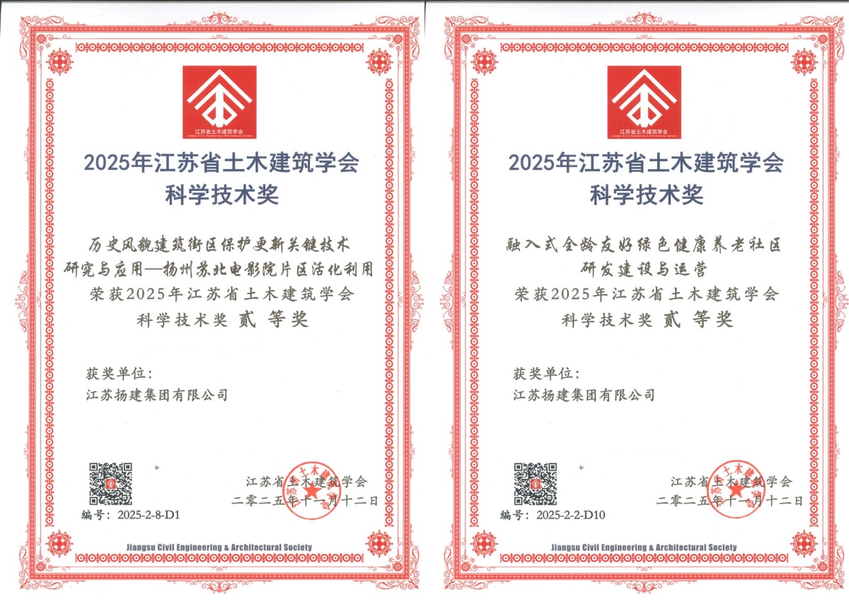 揚建網(wǎng)訊 近日,集團科技創(chuàng)新領域再獲殊榮。在江蘇省土木建筑學會第十一屆理事會第五次會上,由集團技術部牽頭,聯(lián)合項目管理一公司、市政工程分公司、機電安裝分公司、揚州廣陵建工有限公司、江蘇華發(fā)裝飾有限公司共同完成的“歷史風貌建筑街區(qū)保護更新關鍵技術研究與應用——揚州蘇北電影院片區(qū)活化利用”成果獲得表彰,被評定為“2025年江蘇省土木建筑學會科學技術獎”二等獎。