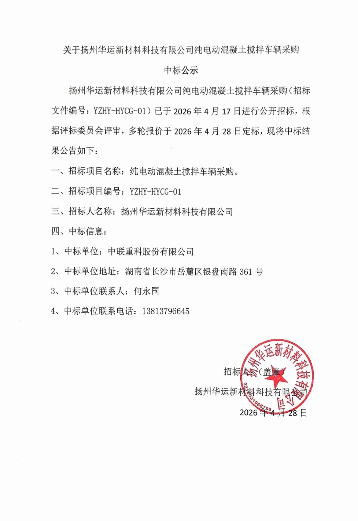 關(guān)于揚(yáng)州華運(yùn)新材料科技有限公司純電動(dòng)混凝土攪拌車輛采購(gòu)中標(biāo)公示